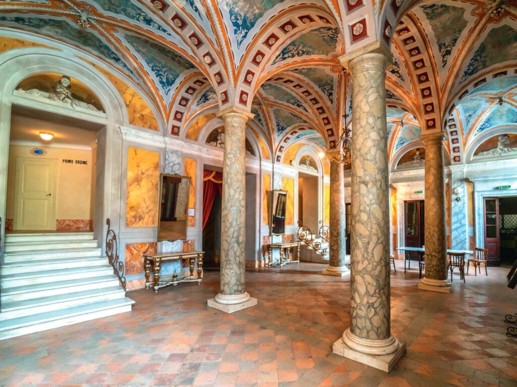 La sapienza tecnica che diventa quasi trucco magico si ritrova specularmente nel pavimento, provvisto anch’esso di un meccanismo che permetteva il sollevamento fino all’altezza del palco.