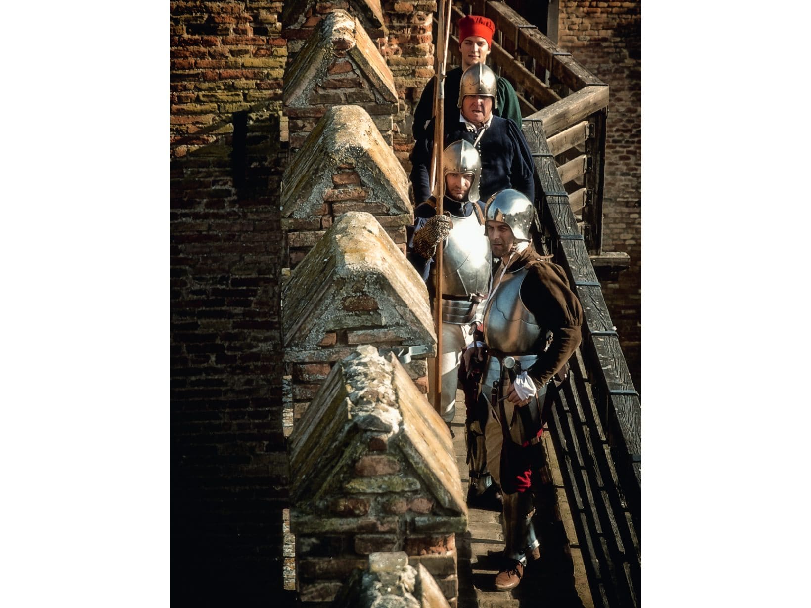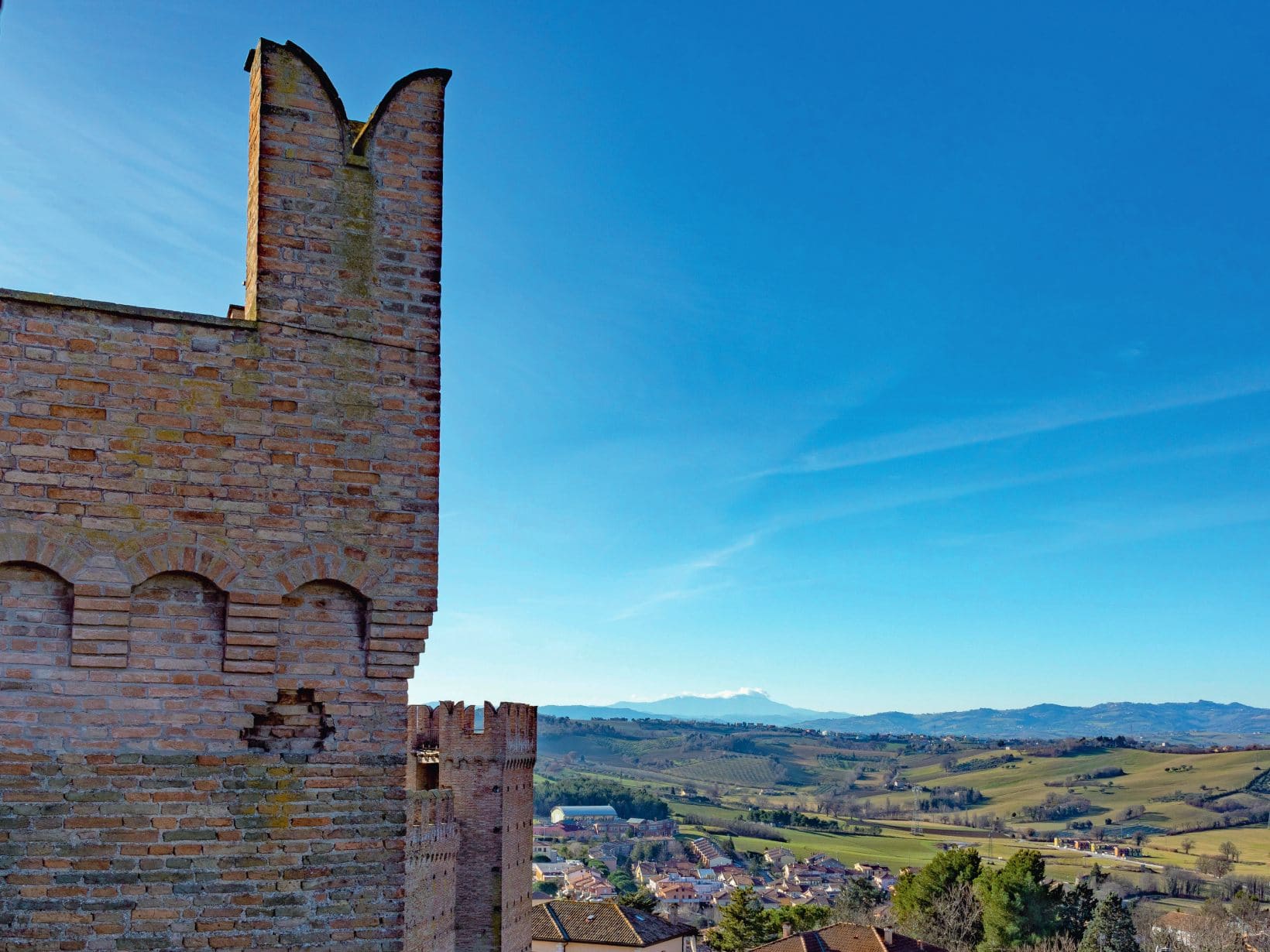 Lungo questo perimetro sopraelevato la vista può abbracciare distanze inaspettate, tanto da raggiungere San Marino o la Rimini dei Malatesta, l’azzurro cristallino dell’Adriatico o le verdi Camminamenti di ronda Spettacoli al Teatro dell’Aria, centro falconeria Giardino degli Ulivi distese del Parco del San Bartolo, che lambisce il comune di Gradara.