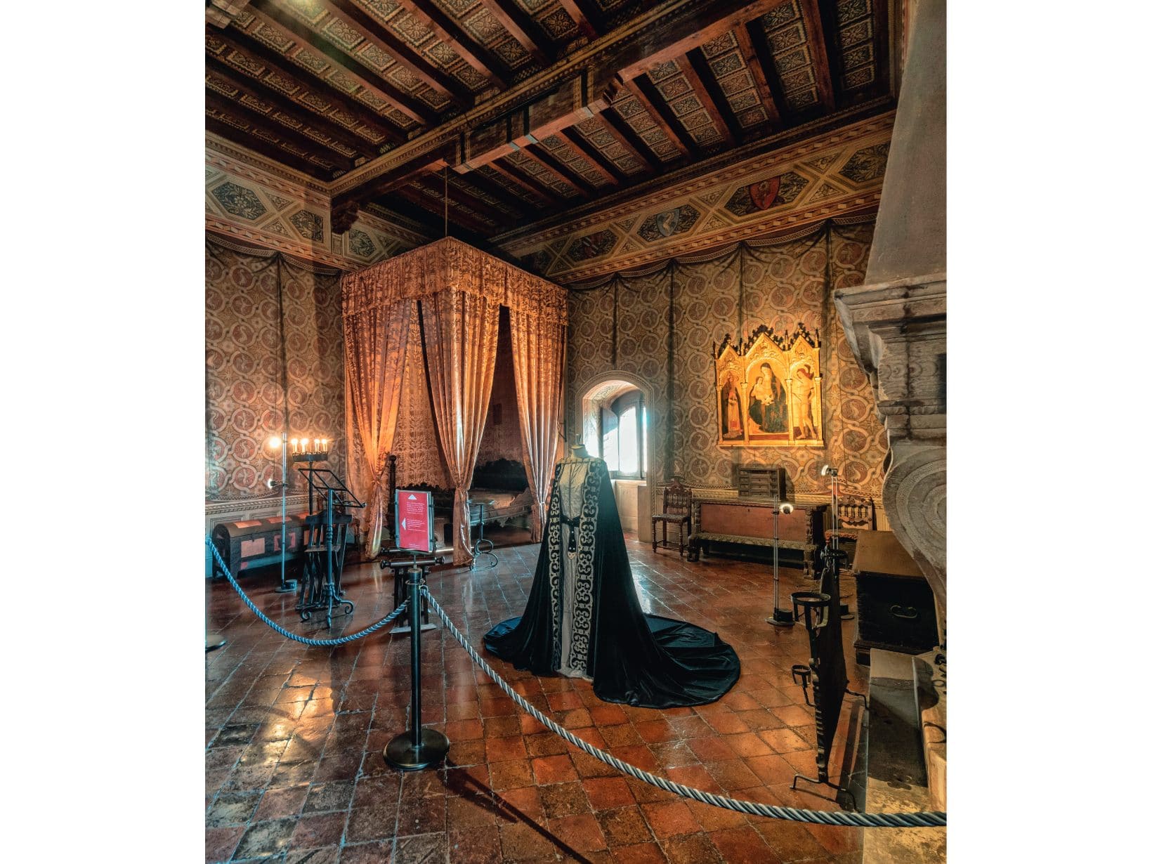 Nella stanza compare anche la replica di uno splendido abito di scena cucito dalla stilista Alberta Ferretti che riproduce quello indossato da Eleonora Duse, amante e musa di D’Annunzio che la volle nel ruolo di Francesca da Rimini nell’omonima tragedia.