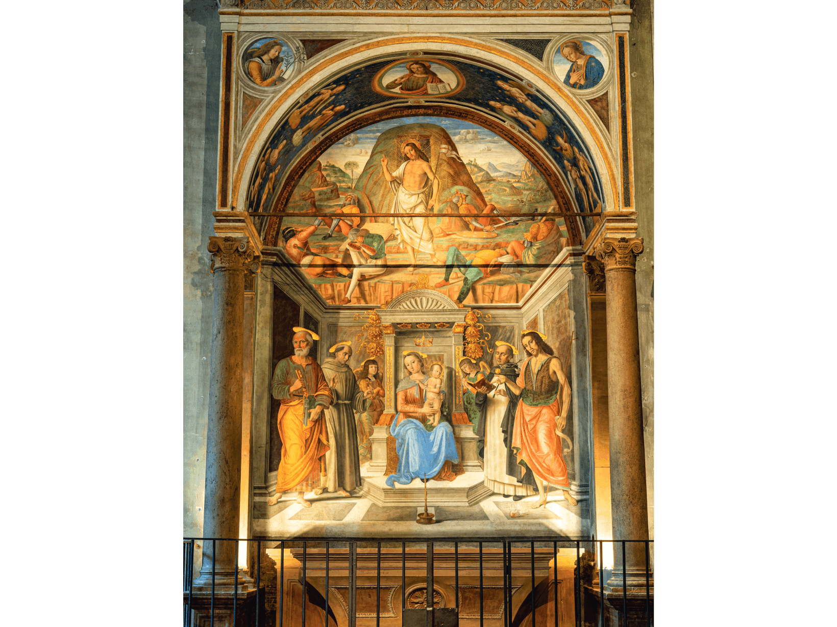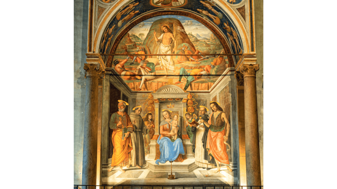 Si tratta della celebre Cappella Tiranni, eseguita nei primi anni ’90 del XV secolo da Giovanni Santi, il padre dell’immortale Raffaello, considerata il suo capolavoro e dal figlio presa come spunto per alcune opere giovanili. Commissionata all’artista da Pietro Tiranni, che provò a superare la disperazione per la morte dell’amata moglie sublimandola con l’arte, la Cappella nei due tondi dei pennacchi dell’arco ritrae l’Annunciazione mentre nella parete di fondo si trovano, in alto, la Resurrezione di Cristo, e più in basso la Sacra Conversazione.