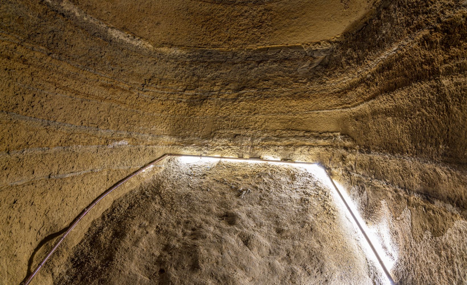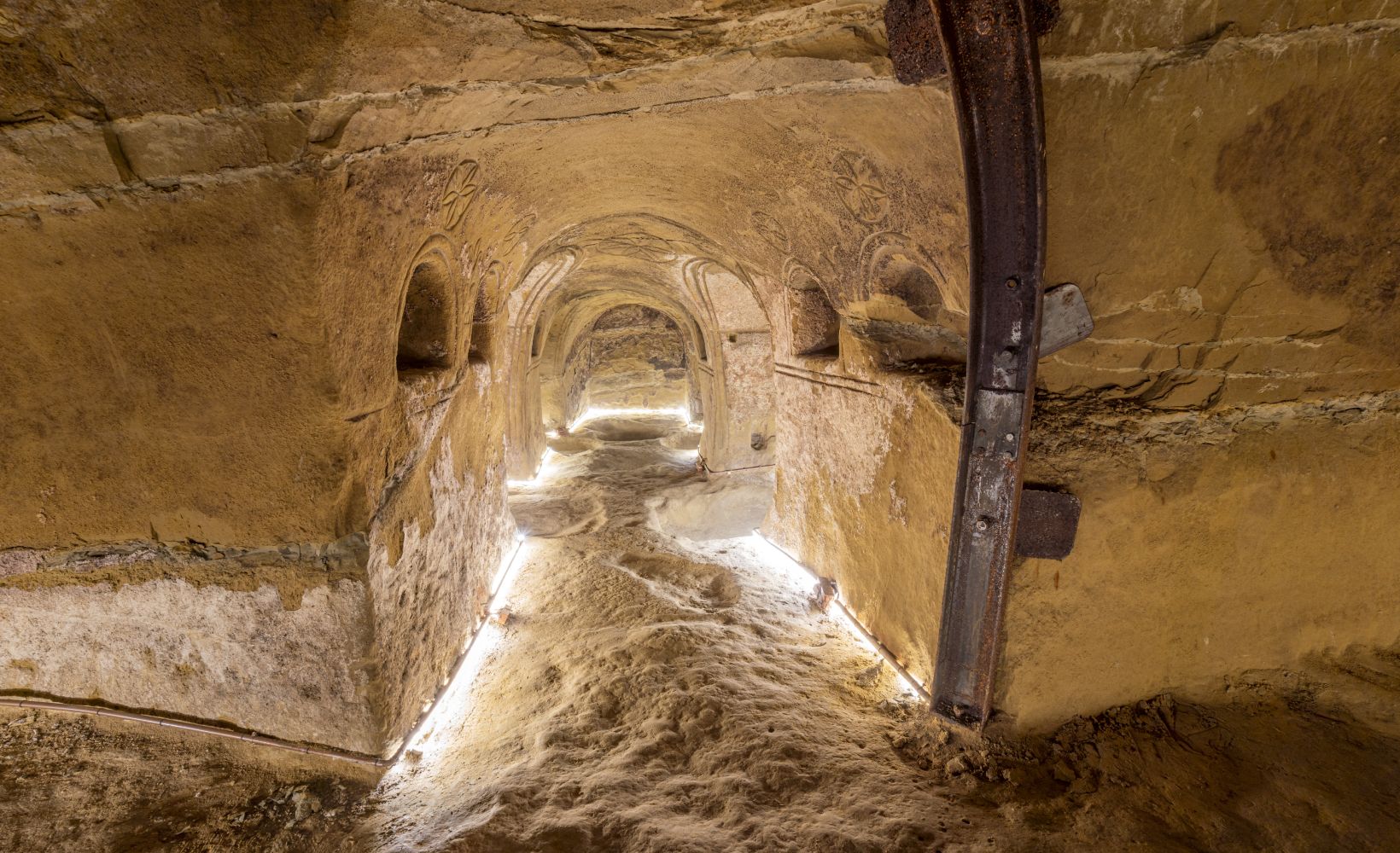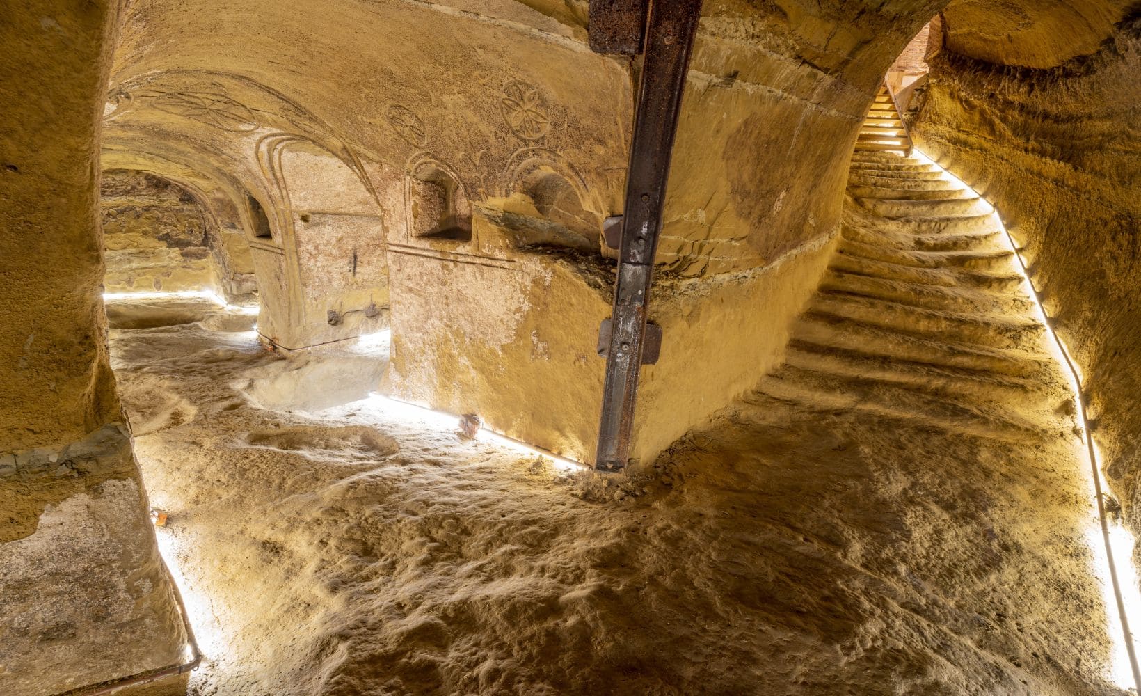 Questa grotta, realizzata dall’uomo secoli fa, è un unicum nel suo genere, in grado di richiamare visitatori e studiosi da tutto il mondo. Già a un primo colpo d’occhio è possibile cogliere una delle caratteristiche principali dell’Ipogeo: il corridoio principale intersecato da bracci orizzontali fa sentire il visitatore come nella navata principale di una chiesa ricavata direttamente nel ventre del sottosuolo.