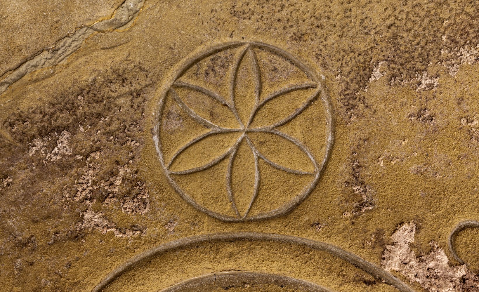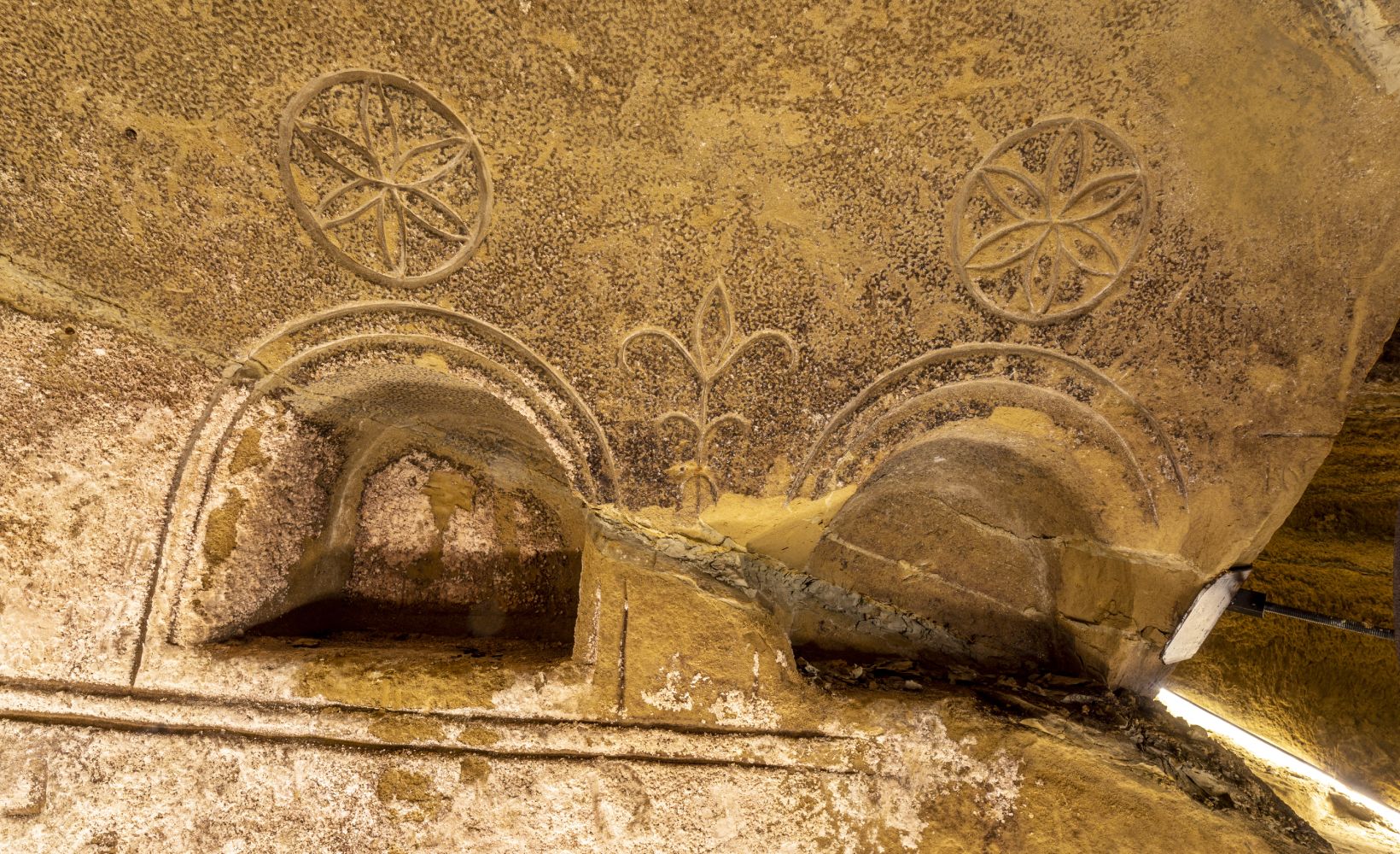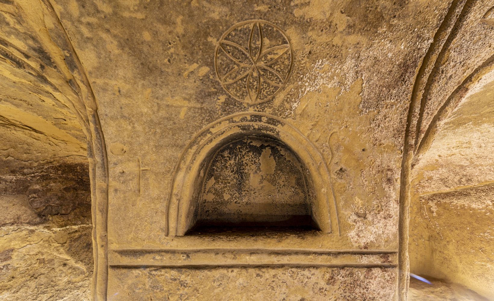 Oltre all’impianto basilicale, un altro elemento che sostiene la funzione sacrale di questo luogo è la presenza di simboli antichissimi riconducibili a un cristianesimo arcaico, in cui si confondono ancora icone pagane. Sia le pareti che la volta sono infatti decorate con incisioni di varia e misteriosa natura, tra cui spicca per ricorsività il cosiddetto fiore della vita, un fiore a sei petali stilizzato e simmetrico utilizzato già in epoca precristiana.