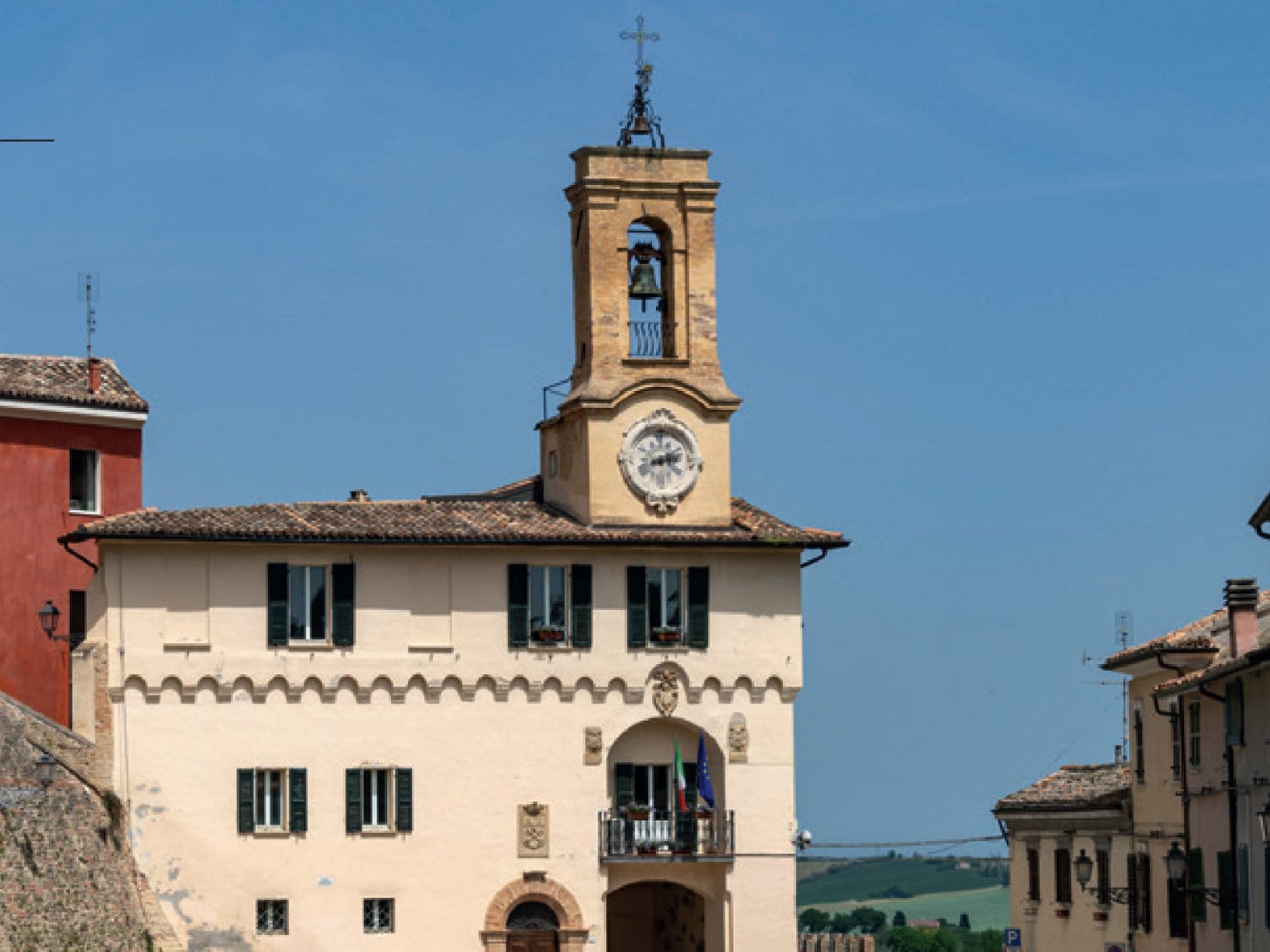 Tutto questo è il centro storico di Cartoceto, il cui nucleo storico ha una conformazione particolare e unica nel suo genere: le vie sono organizzate a spina di pesce, lungo la strada principale (un tempo definita “via di mezzo”) che scende entro le mura e prosegue verso piazza Garibaldi, ex Piazza del Mercato, su cui si affaccia Palazzo del Popolo, una struttura trecentesca che si distingue per la particolare Torre dell’Orologio, su cui è affisso un orologio solare fatto costruire nel XVII secolo e che fu più volte restaurato.