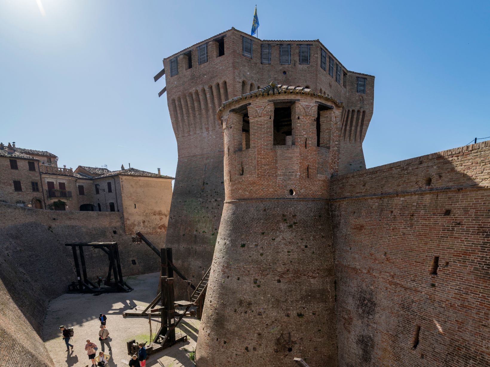 La Rocca Roveresca si caratterizza per la sua forma pentagonale, con torrioni angolari che emergono maestosi, costruita utilizzando materiali tradizionali quali mattoni e pietra. Questa struttura non era soltanto una fortezza impenetrabile, ma fungeva anche da residenza signorile e centro di comando, dimostrando la doppia funzione militare e civile dell’edificio. Elementi architettonici rinascimentali, come il cortile d’onore, il loggiato e le bifore, arricchiscono la sua estetica, testimoniando l’ingegno e la creatività di Martini.