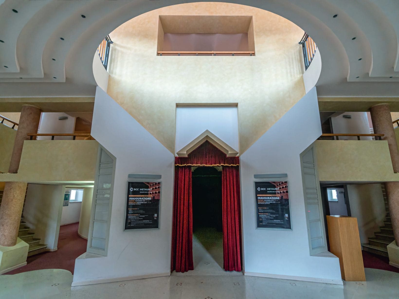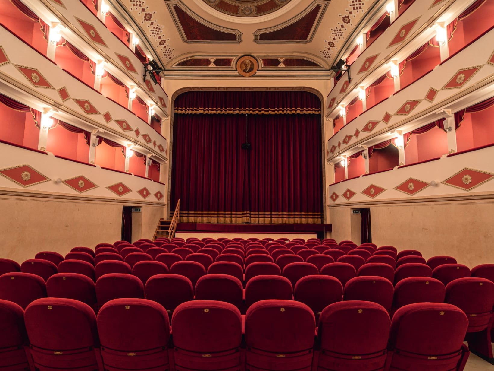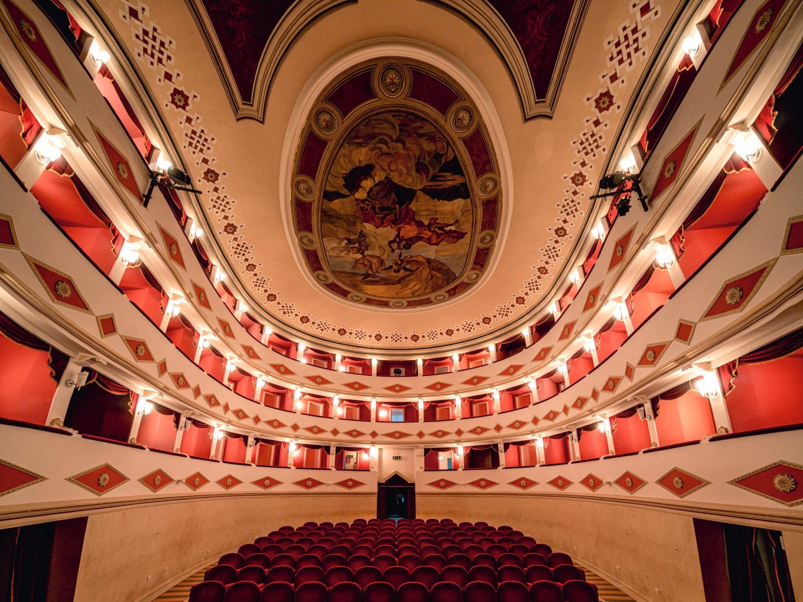 Il Teatro Battelli è un tempio dell’arte, la cui architettura canta l’ode all’ottocento con i suoi palchi a ferro di cavallo e le sue decorazioni in stucco, un retaggio di quell’epoca che ancora oggi incanta e meraviglia. Nel suo interno, i dettagli novecenteschi si fondono con il gusto liberty, come nel grande ovoide che domina la volta, dove un’immagine simbolica di Macerata Feltria ascolta il divino Apollo, in una rappresentazione che è quasi una preghiera dipinta, una richiesta di eterna bellezza e ispirazione.