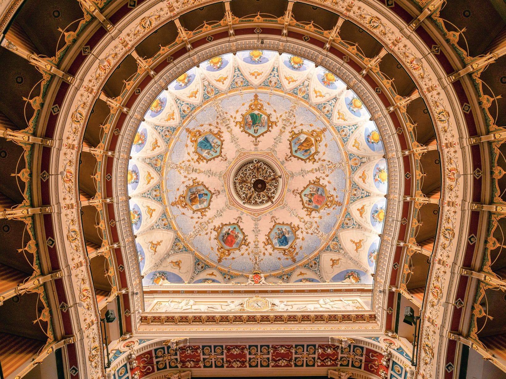 Lo spettacolo continua se si alza lo sguardo per poter ammirare la volta in tonalità azzurre, così sapientemente stese da creare un trompe l’oeil che dà la sensazione di concavità del soffitto, dove le raffigurazioni allegoriche delle sette arti liberali circondano il lampadario che nasconde un particolare trucco di scena. Esso infatti può essere sollevato e riabbassato attraverso un meccanismo per regolare effetti e giochi di luce nella sala.