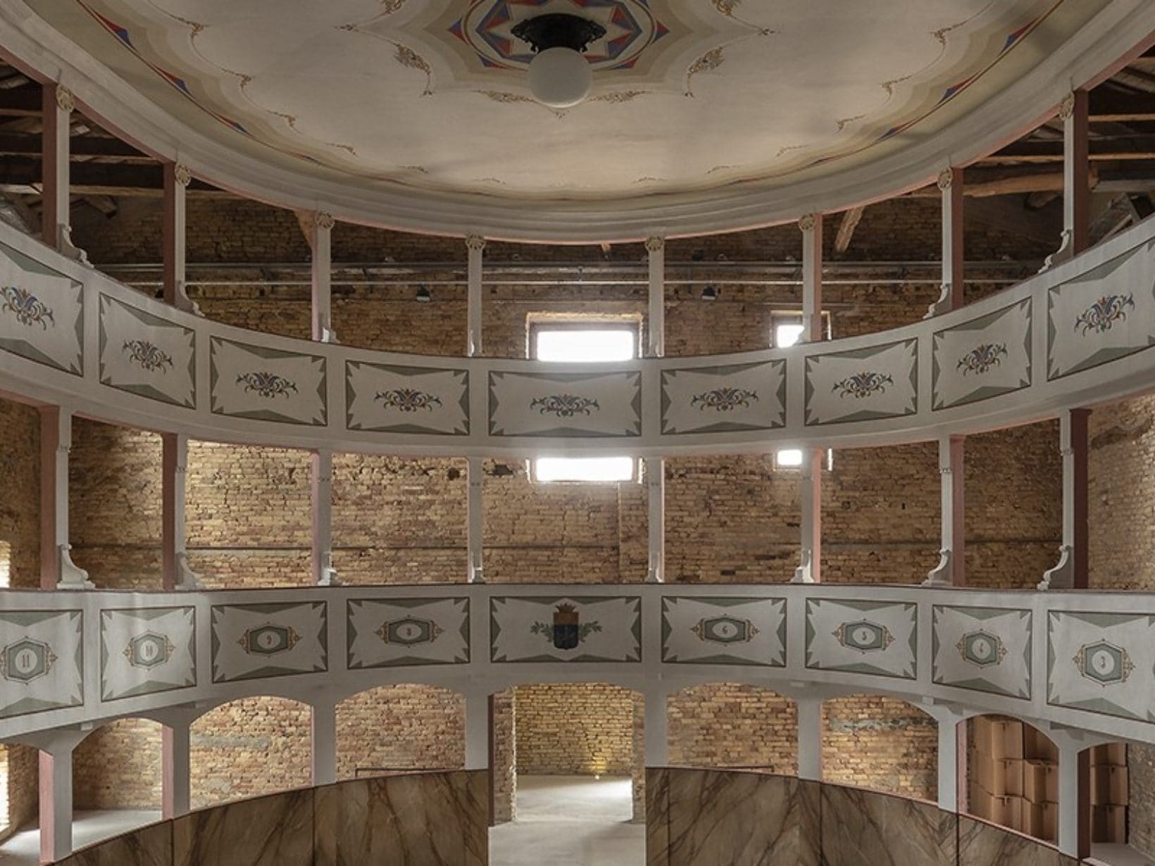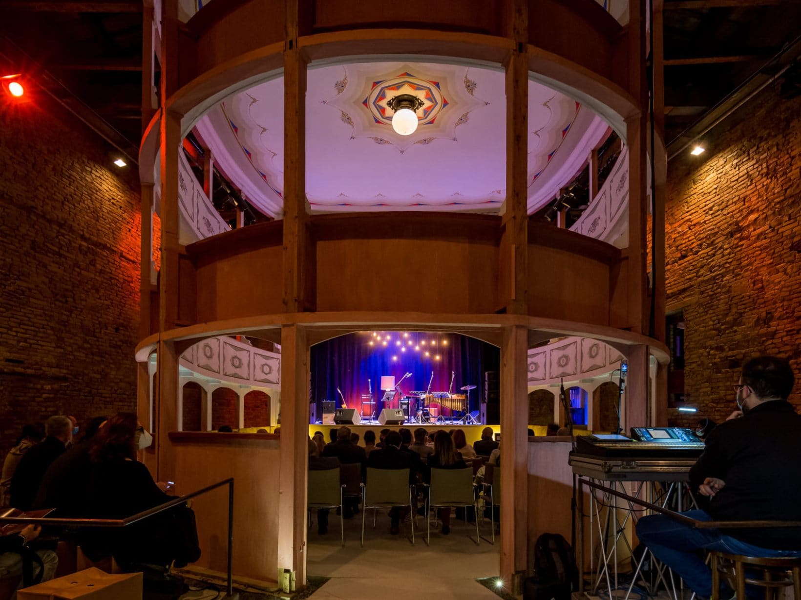 Percorrendo poi i gradini che conducono al piano superiore, si può ammirare la sala del teatro vero e proprio che simula l’ordine dei palchi tramite uno scheletro ligneo posizionato nel mezzo del locale. Lo spazio scenico è estremamente versatile permettendo persino l’inversione della platea e del palco e realizzando così un piccolo teatro elisabettiano con la scena al centro e il pubblico tutto attorno.